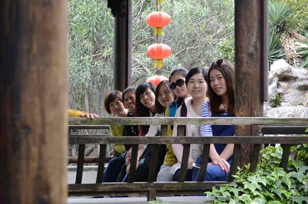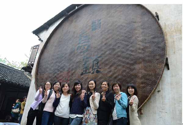 看~公司的美女们在乌镇面前留下了自己的倩影。手势和表情多么相似,和谐,这和平时工作在一起有莫大的关系,看来团队的力量可以影响一人的一言一行。