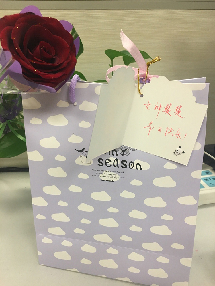 都说女人如花,再也没有什么比得上鲜花所带给女人的幸福感。一大早,女神们一踏入办公室,便看到自己的办公桌上摆放着一枝娇艳欲滴的玫瑰,还有一个精致的礼品袋。虽然礼物很简单,却承载了公司对员工满满的关爱和最真诚的祝福,希望女神们永远如花般娇艳,努力绽放自己的美丽。一天的美好,由鲜艳的红色玫瑰为大家开启。